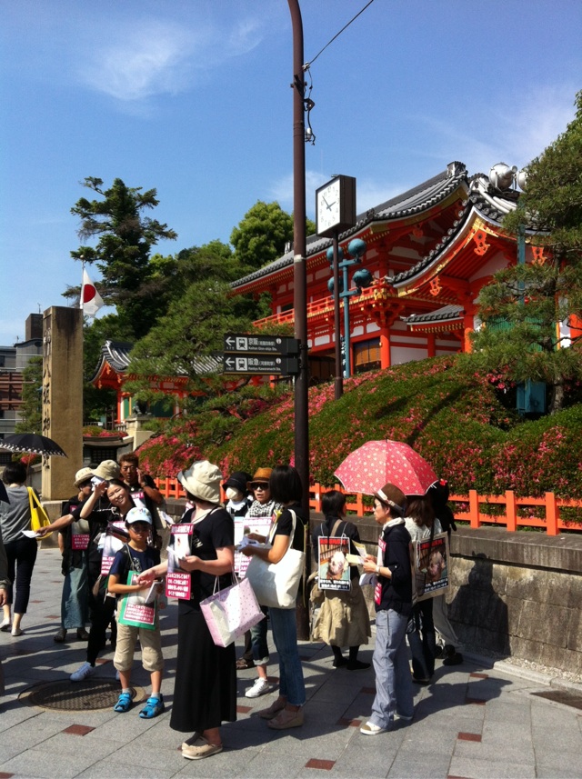 コース途中にある、円山公園道(八坂神社)にトイレがあるので、今まではココで一旦止まっておりましたが、本来デモ行進中の休憩とみられる行為は禁止になっており、今回警察の方からその点厳しく注意を受けましたので、いつものように荷物をいったん置いて一息つく事はできなくなりました。Uターンしてそのまま出発となりますので、トイレに行かれる方は後から追いかけてきてください。